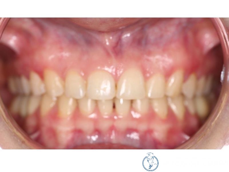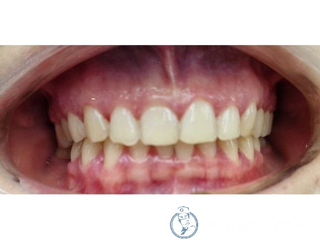 Диагноз: 1 класс Энгля, глубокое резцовое перекрытие, скученное положение передней группы зубов н/ч, сагиттальная щель, адентия 36, 46 зубов