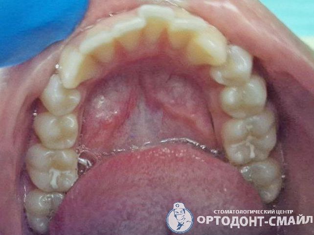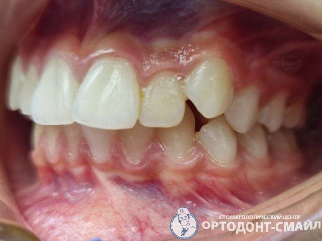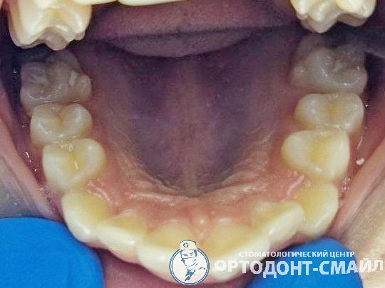 Диагноз: 1 класс Энгля, перекрёстная окклюзия, адентия 12 и 22 зубов